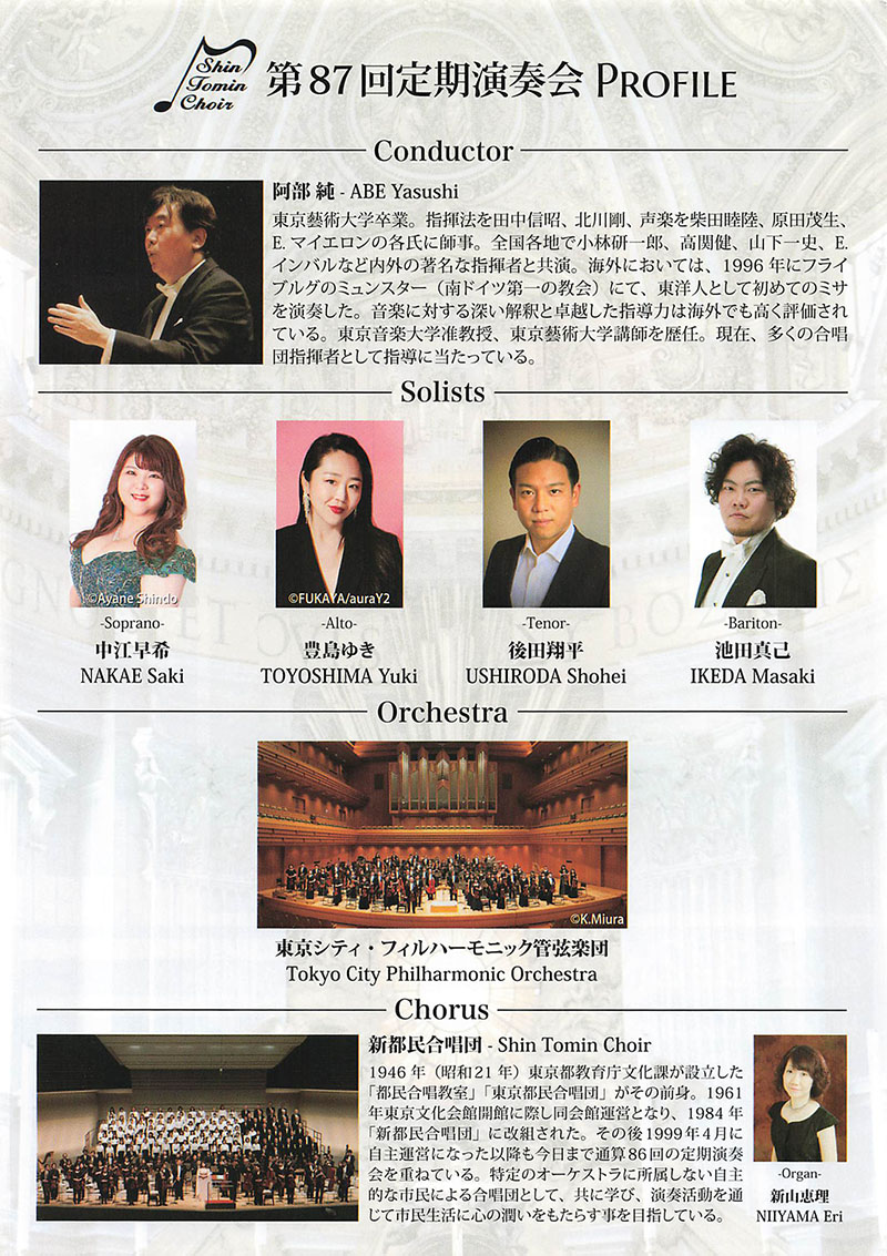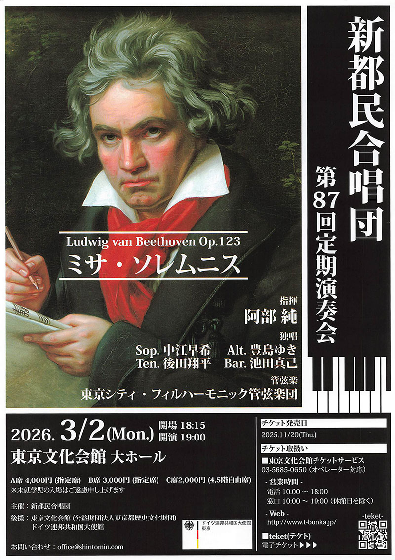 2026年3月2日の次回、第87回定期演奏会では、ベートーヴェンの『ミサ・ソレムニス(荘厳ミサ)』を演奏します。詳細は下記の通りです。 br>